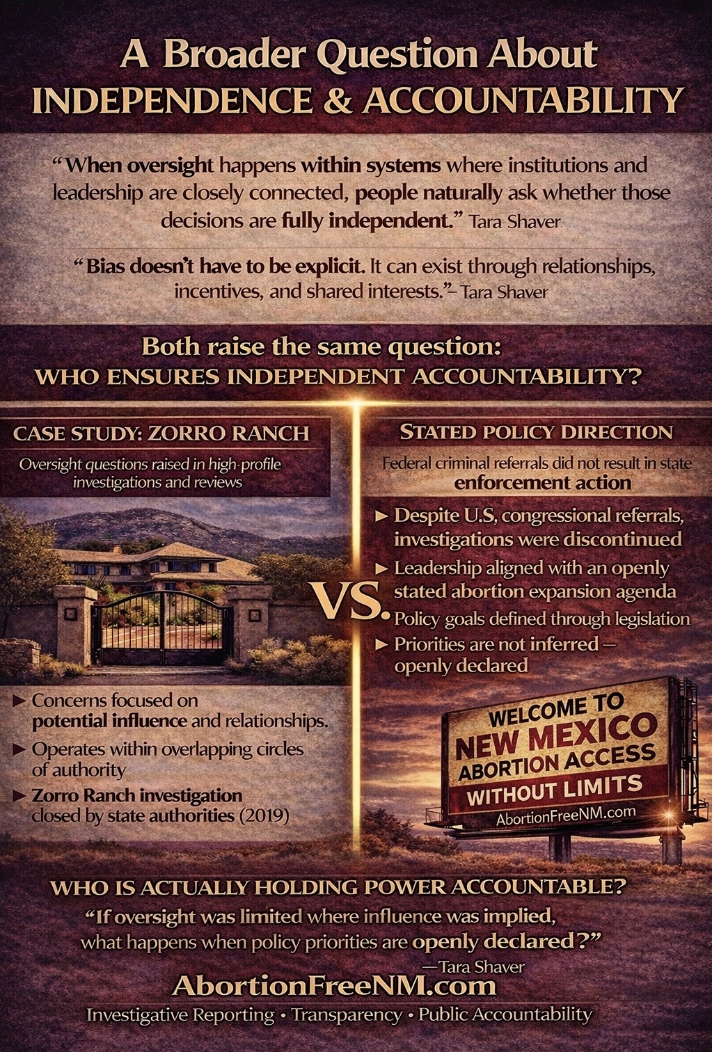 “Authority means nothing if it isn’t used. When leaders openly state their support for expanding abortion access—and when overlapping relationships and institutional ties exist within the same systems responsible for oversight—people will reasonably ask whether those factors influence what gets investigated, what doesn’t, and how decisions are made, including the decision to close the Zorro Ranch investigation.”— Tara Shaver, Abortion Free New Mexico