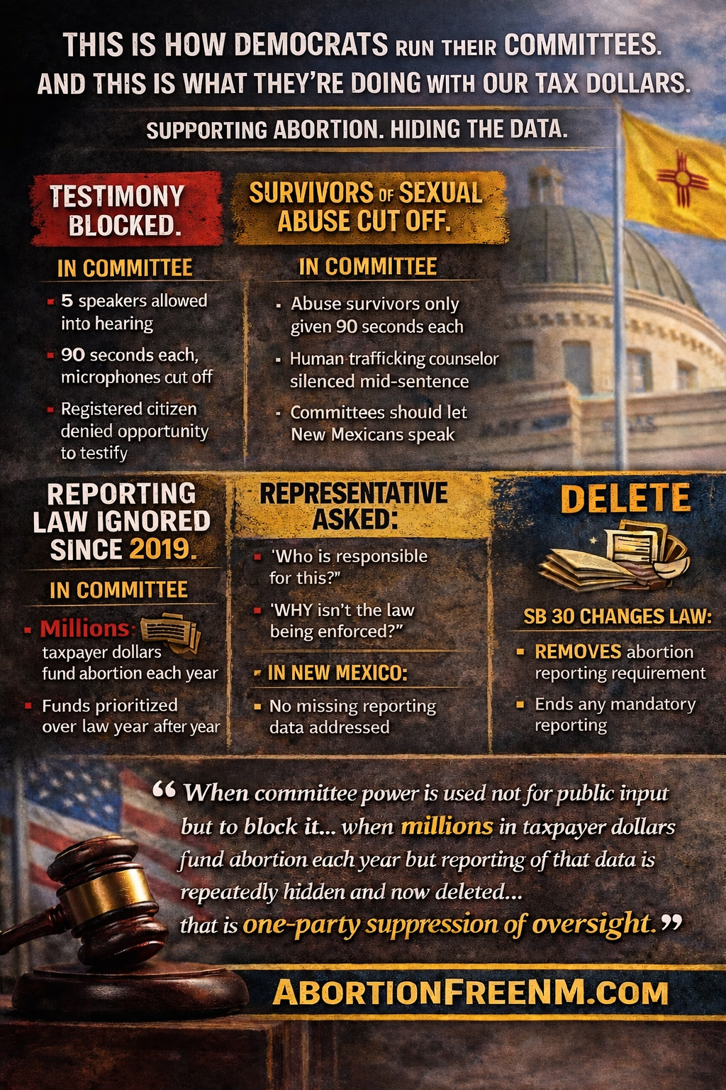 “One-party control becomes dangerous when it turns into one-party suppression. The gavel should not be a weapon. I followed the rules — I registered to testify, I prepared remarks — and I was blocked from speaking. That is not open government. If abortion reporting hasn’t been published since 2019, the answer is investigation and enforcement — not deleting the statute so the violation disappears. When millions in taxpayer dollars fund abortion each year but reporting of that data is hidden and now deleted, that is one-party suppression of oversight. New Mexicans should not tolerate laws being ignored and then erased to cover the failure.”