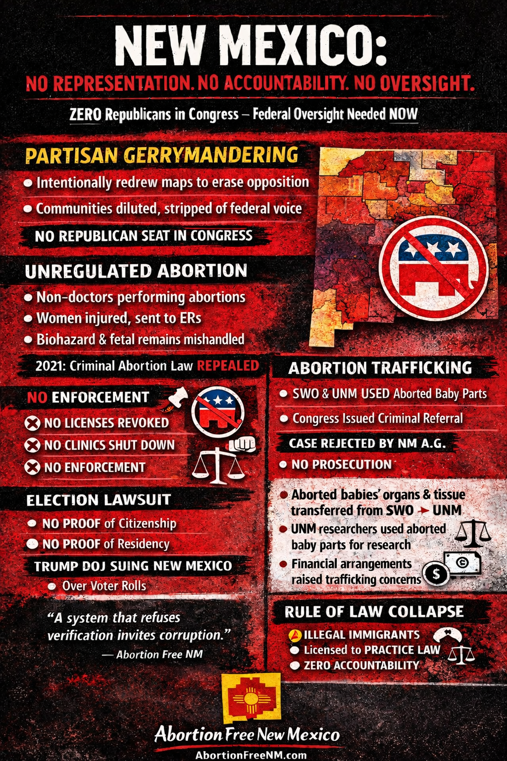 Abortion Free New Mexico emphasizes that New Mexico cannot reform itself internally after intentional redistricting eliminated the state’s only Republican seat in Congress, leaving millions of residents without meaningful federal representation and no internal check on one-party power.